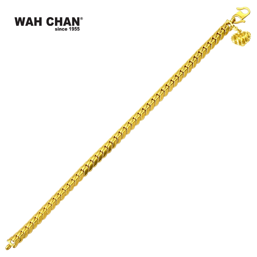 Embodying tradition with a bold modern twist, the Wah Chan 916 (22K) gold Rantai Tangan Lipan bracelet showcases a distinct pattern inspired by heritage links. Crafted in luminous gold, its layered structure delivers a confident presence while remaining effortlessly refined. The secure finish is accented by a textured charm that adds a playful yet elegant flourish. Whether as a meaningful gift or a treasured personal piece, this design speaks of strength, prosperity and the timeless artistry of Malaysian craftsmanship.