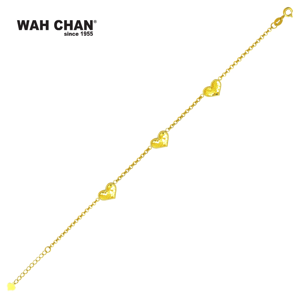 Delicate and expressive, the Wah Chan 916 (22K) gold Rantai Tangan Triple Heart bracelet captures the essence of affection through three finely textured heart motifs. Each charm is gracefully spaced along a slender gold chain, creating a romantic rhythm that evokes meaningful memories and timeless promises. With every shimmer, it reflects sincere sentiment and heartfelt connections. A thoughtful keepsake for anniversaries or personal milestones, this bracelet embodies Wah Chan’s enduring craftsmanship and the love stories it has celebrated for generations.