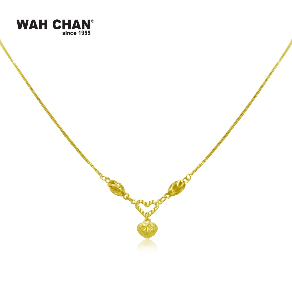 A poetic expression of love and tradition, this 916 gold necklace from Wah Chan features a heart-shaped centre accented by a finely detailed golden charm. The balanced silhouette flows seamlessly into a polished gold chain, symbolising unity and enduring affection. Whether gifted as a romantic gesture or worn to mark a meaningful moment, this piece carries a quiet elegance that reflects Wah Chan’s legacy of heartfelt craftsmanship. A timeless treasure made to honour bonds that last a lifetime.