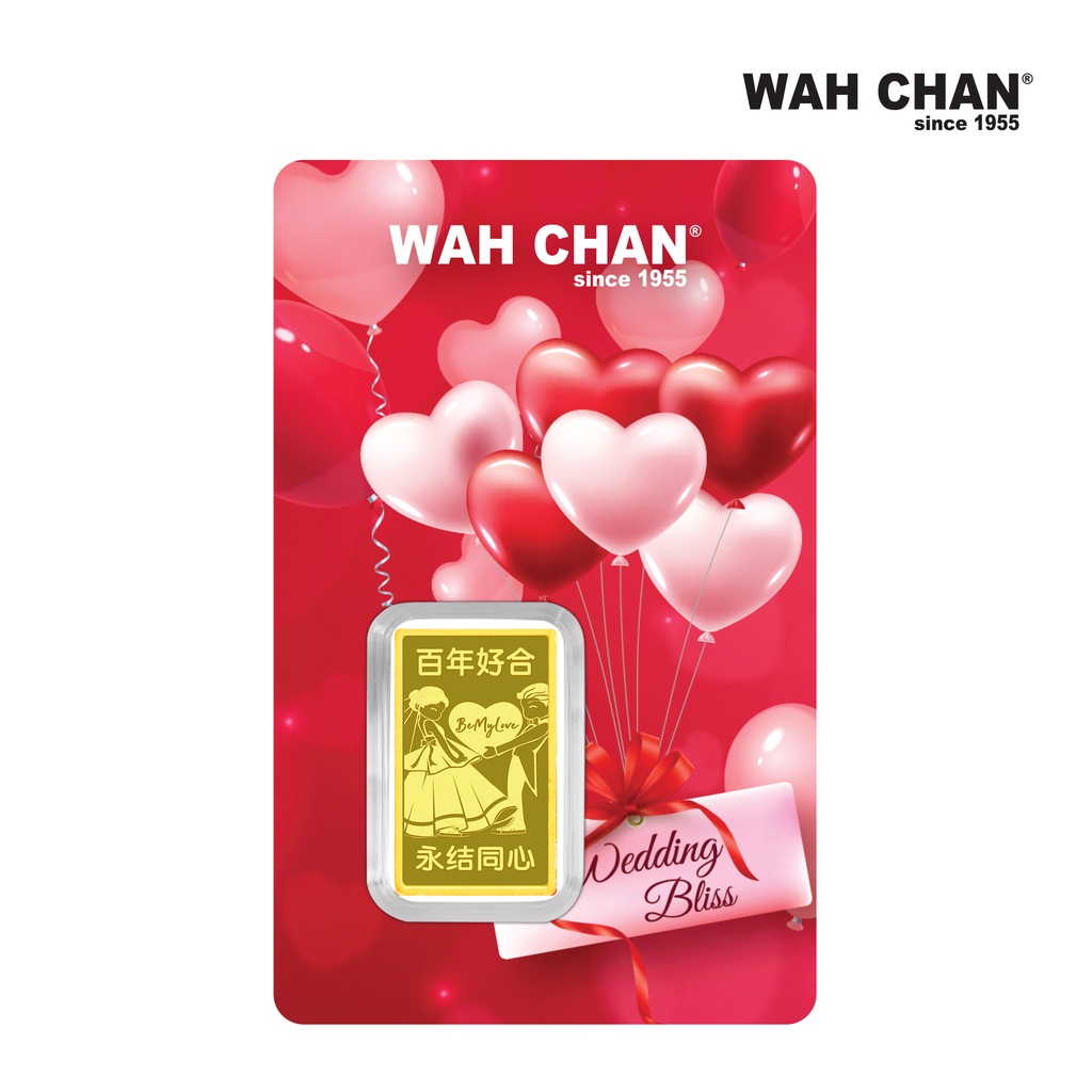 Celebrate love that lasts a lifetime with Wah Chan’s Wedding Bliss gold bar, designed to capture the essence of unity and devotion. Crafted in 999.99 fine gold, this piece features a romantic bride and groom illustration set against a cascade of heart-shaped balloons, symbolising everlasting happiness. Whether gifted as a wedding memento or anniversary keepsake, it embodies the preciousness of shared moments and promises. A meaningful treasure for those embarking on their journey together in love.