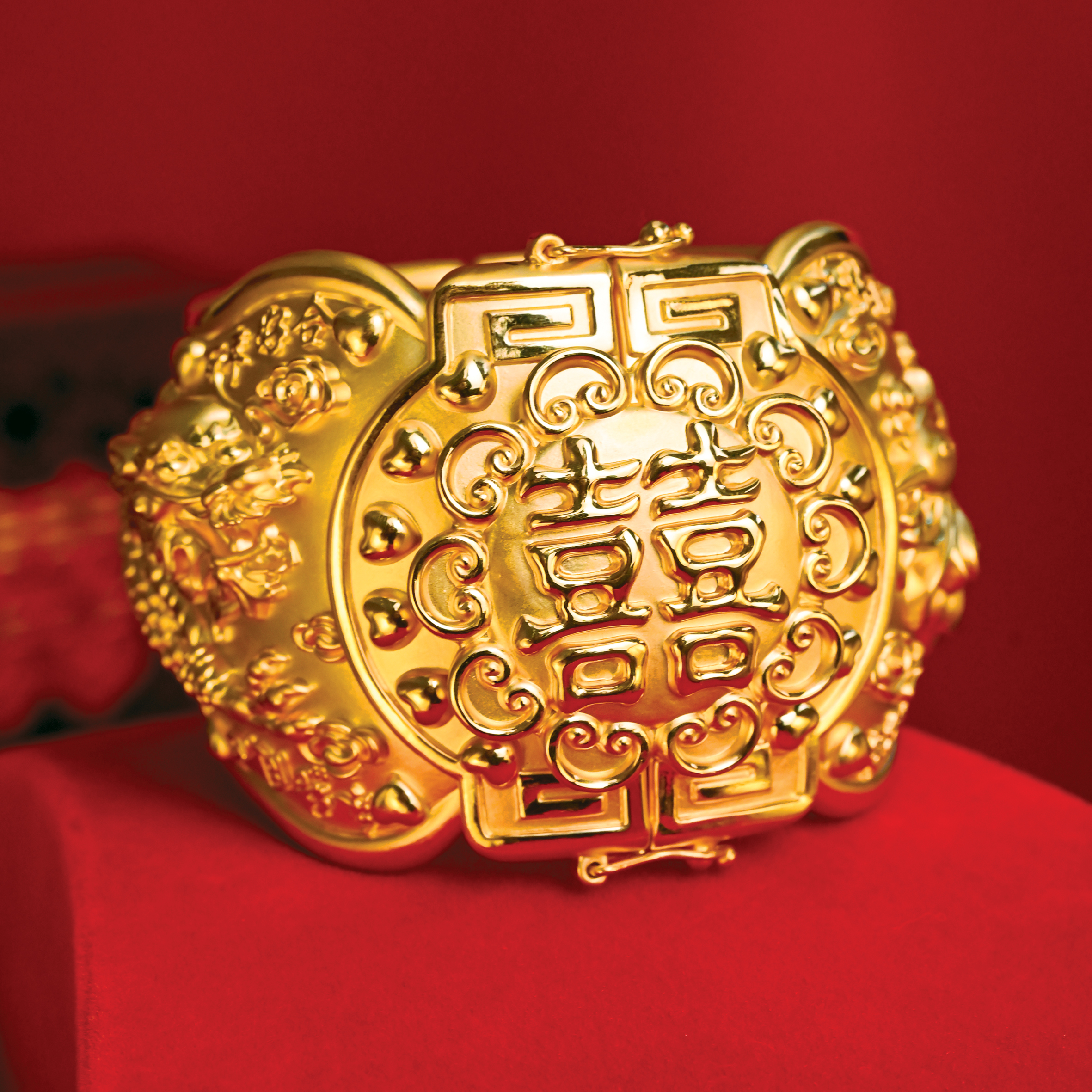 Designed around the iconic 囍 (Double Happiness) symbol, this 999 gold bangle embodies joyful union, harmony, and lasting love — a meaningful choice for Chinese bridal gifting and traditional wedding ceremonies.