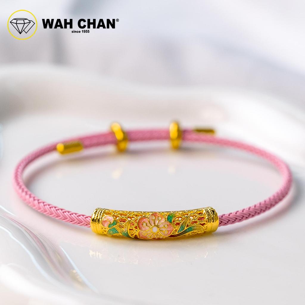 A charming pink woven bracelet accented with a beautifully crafted gold floral centerpiece. Its delicate enamel details and adjustable gold fittings make it a perfect blend of femininity, elegance, and everyday wearability.